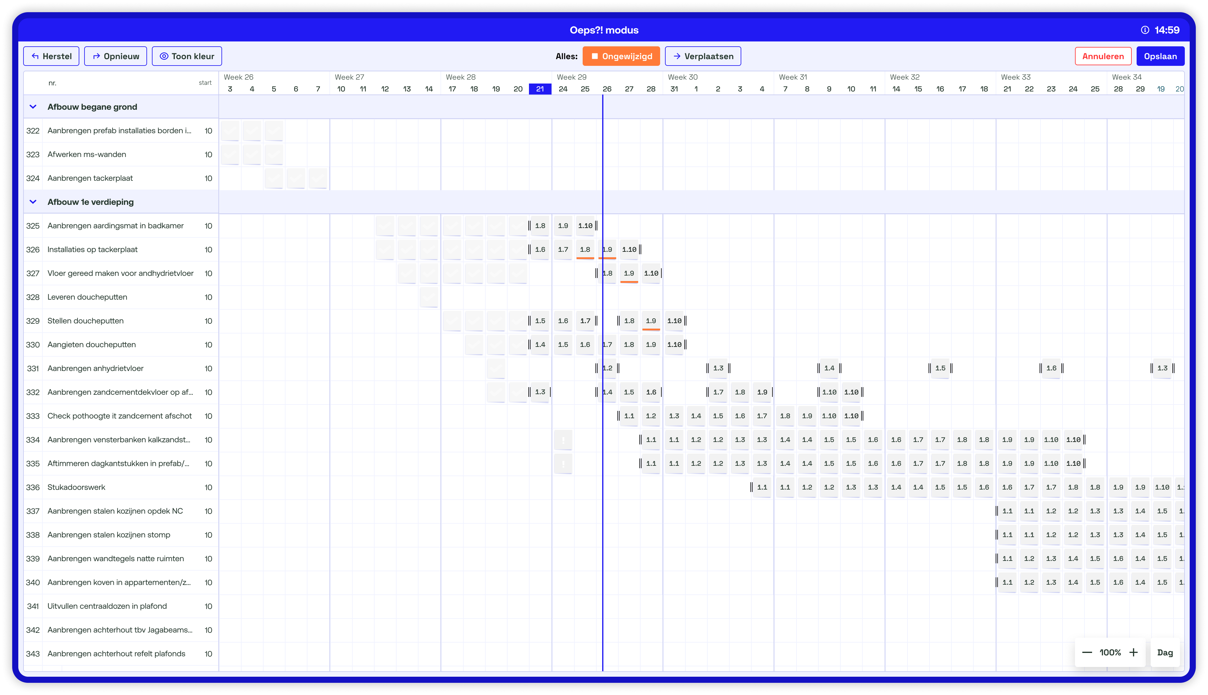 Mit aktuellem Einblick, festen Verantwortlichkeiten und visuellen Signalen ist der Status jederzeit klar. Abgeschlossene Arbeiten sind sichtbar, Verzögerungen fallen sofort auf, und die Farbgebung zeigt, welcher Baupartner aktiv ist.