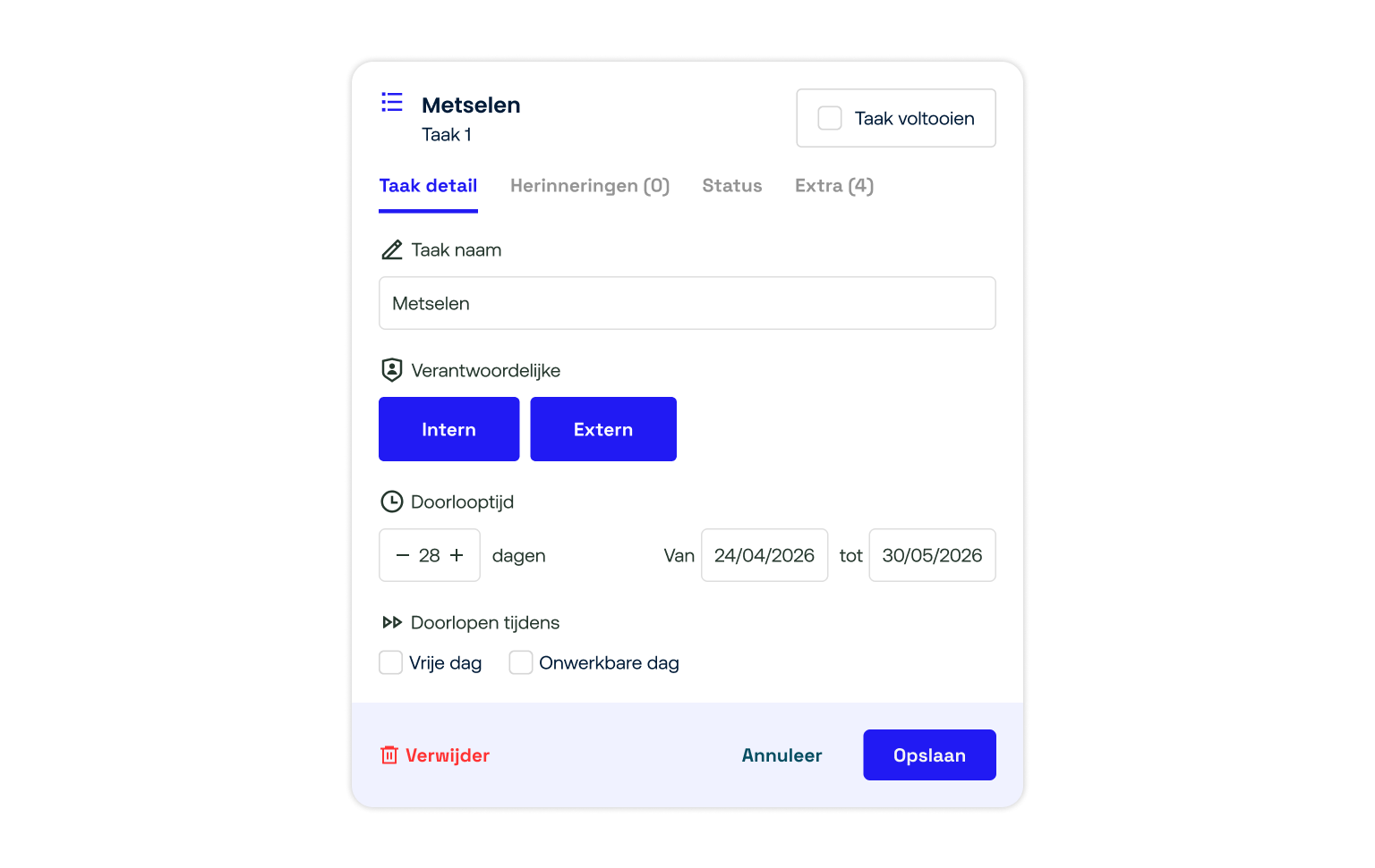 Bepaal in een handomdraai welke taken je door eigen personeel laat uitvoeren. Net zoals je nu al gewend bent om iemand verantwoordelijk te maken, kies je straks eenvoudig voor 'intern' of 'extern'. Bij een interne taak koppel je direct de juiste collega. Zo blijft de KYP-planning het kloppende hart van elk project.