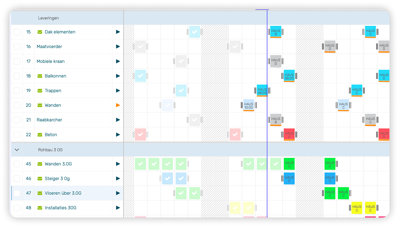 Plan zowel je logistieke planning als je uitvoeringsplanning in één geïntegreerd overzicht. Leveringen, kraaninzet, transport en bouwstromen staan direct in relatie tot de werkzaamheden op de bouwplaats. Zo zie je niet alleen wat er gebeurt, maar ook wat daarvoor nodig is.
