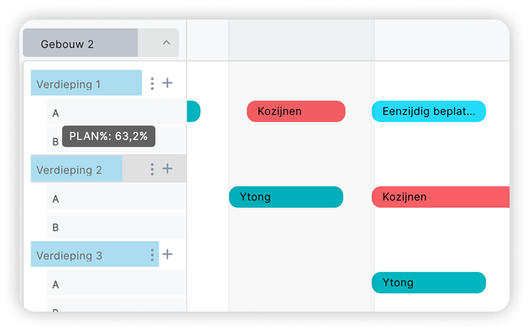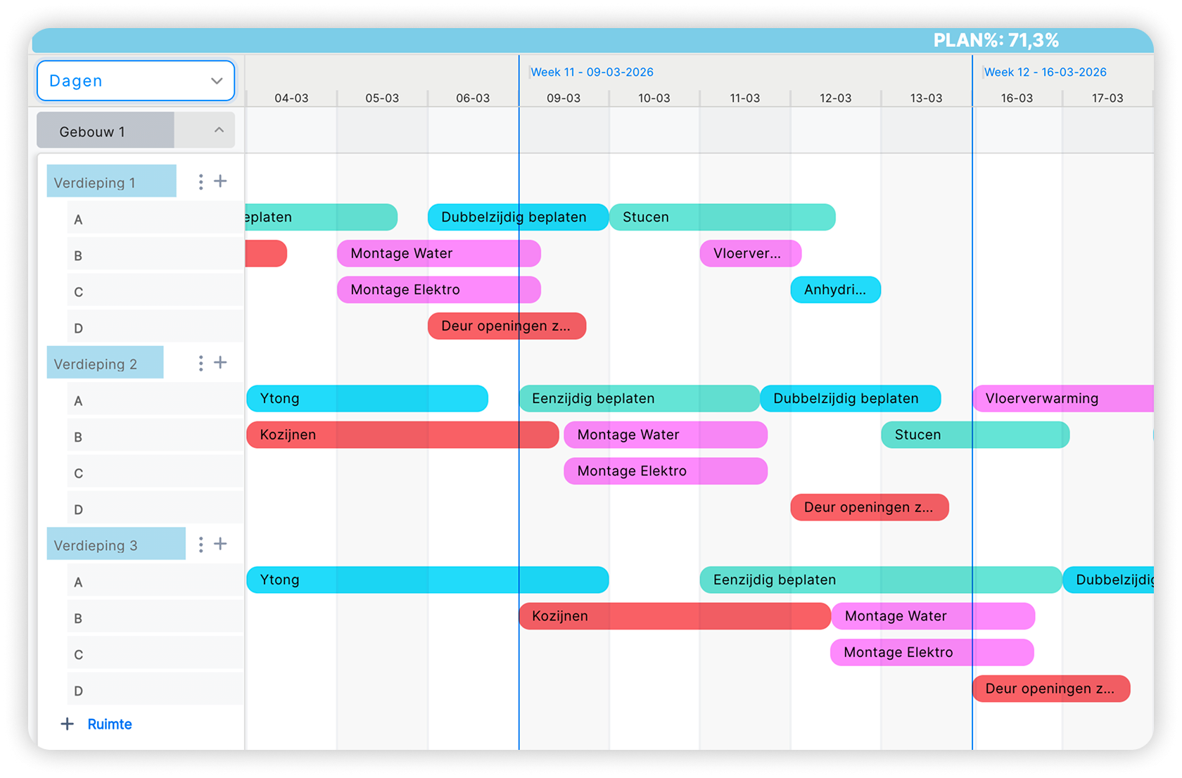 By planning based on location, you start thinking differently about your schedule. When location comes first, a clear “train” is created. This provides insight into which subcontractor starts where and who follows next. Teams no longer get in each other’s way, and you can focus on speed and efficiency.