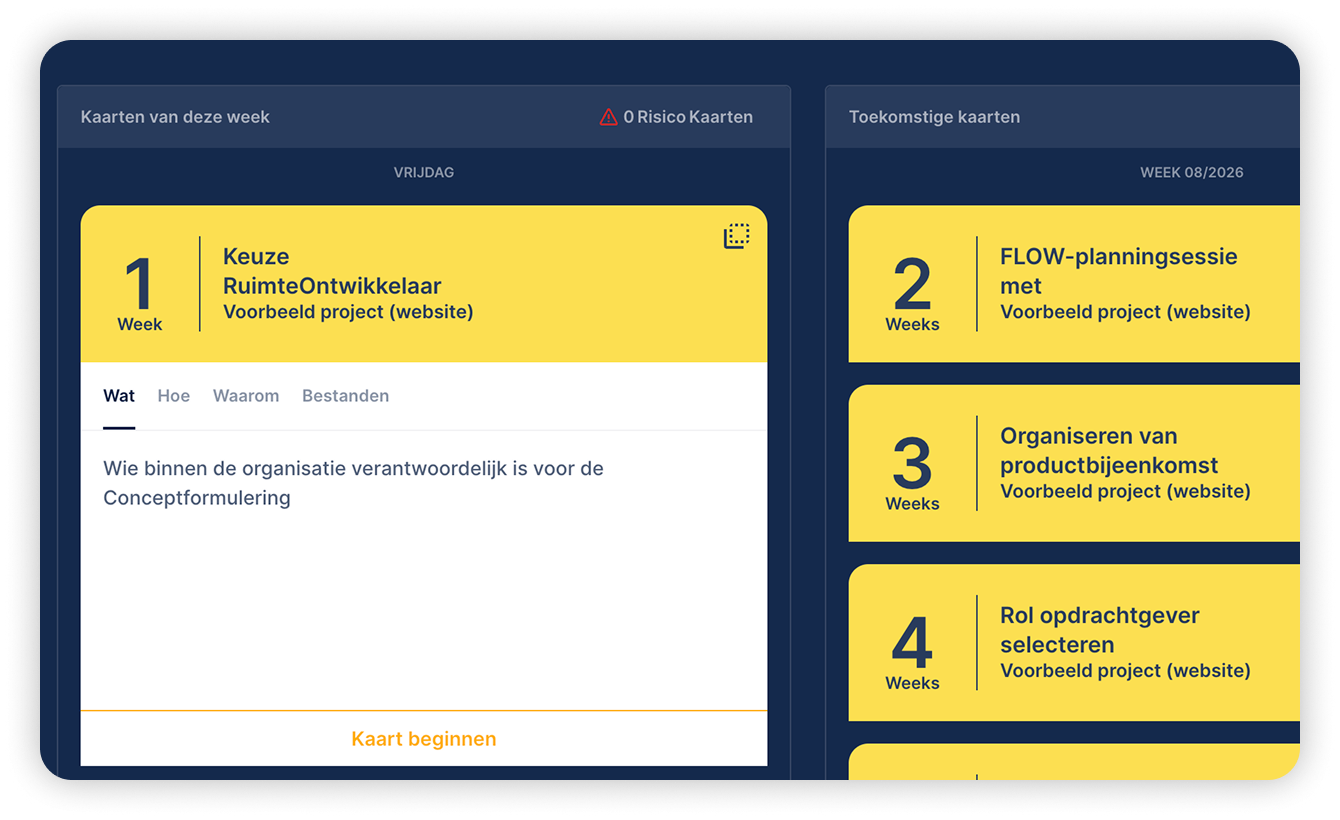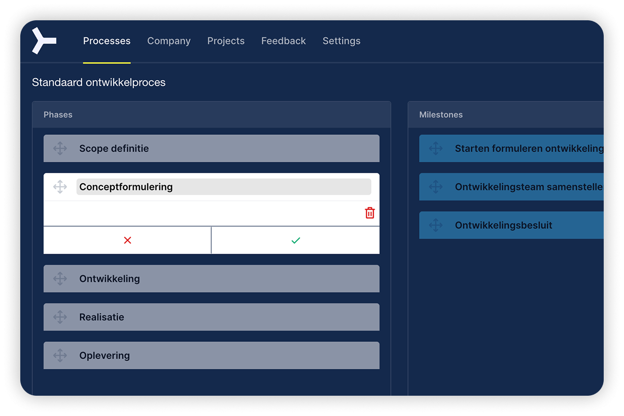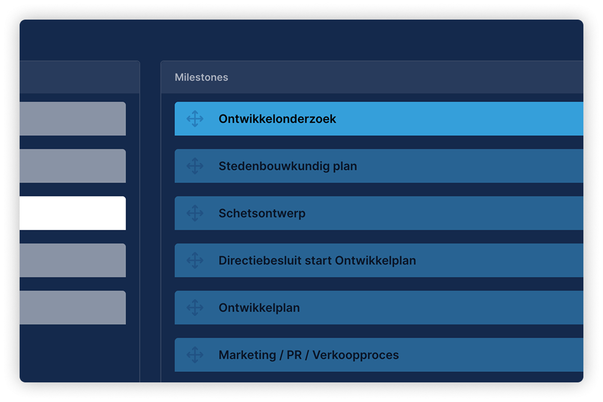 The structure of processes is often similar. Each process consists of different phases such as initiation, preparation, execution, sale and or rental. This fixed structure makes digitalisation easier and clearer for everyone involved in the process.
