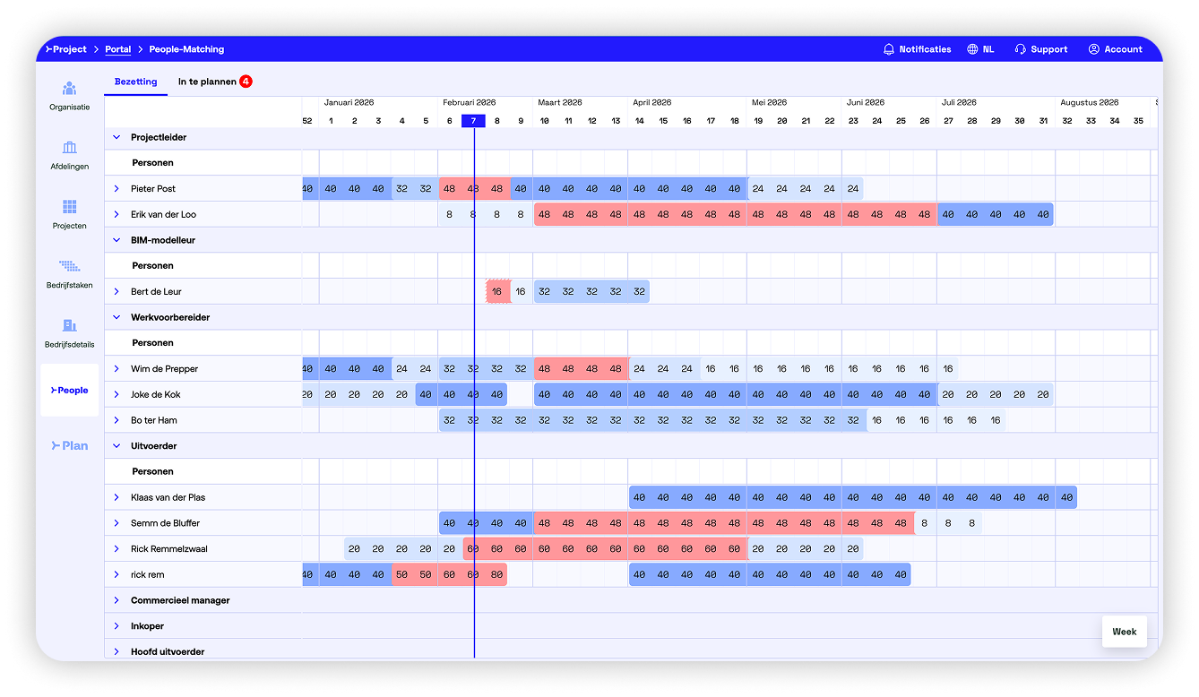 Match the required capacity directly with available employees and project partners. In one overview, you see who is available, where there is room, and where adjustments are needed. By linking planning and capacity intelligently, you always work with the right people and partners at the right time.
